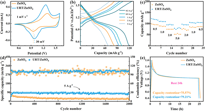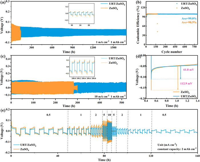 | Fig. 4. (a) Long-term cycle performance of a Zn//Zn symmetric battery at 1 mA/cm2 for 1 mAh/cm2. (b) Coulombic efficiency of a Zn//Cu asymmetric battery at 1 mA/cm2. (c) Long-term cycle performance of Zn//Zn symmetric batteries at 10 mA/cm2 for 1 mAh/cm2. (d) Nucleation overpotential of Zn anode in URT/ZnSO4 and ZnSO4 electrolyte at 5 mA/cm2. (e) Rate performance of a Zn//Zn symmetric battery with ZnSO4 electrolyte and URT/ZnSO4 electrolyte. | |