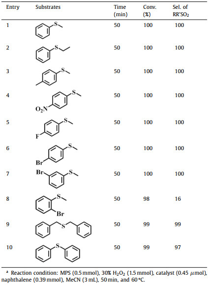 As shown in Fig. S10 (Supporting information), the reaction mechanism was speculated by us. First, the catalyst reacts with the H2O2 to form the electrophilic peroxide intermediates; then the substrate of the sulfides got the O atoms from the electrophilic peroxide intermediates; finally, the electrophilic peroxide intermediates are reduced into the initial conditions for the next recycling. Some similar mechanisms were proposed in the literature formerly [41,50,51].