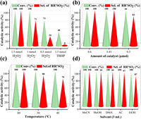 | Fig. 3. (a) Impact of the oxidant amount and type of for the catalytic capacity of 1. (b) Impact of different amount of catalyst on the catalytic capacity of 1. (c) Impact of the temperature on the catalytic capacity of 1. (d) Impact of different solvents on the catalytic capacity of 1. Conditions: MPS (0.5 mmol), catalyst (0.39 μmol), naphthalene (0.39 mmol), solvent (3 mL), 60 ℃, and 50 min. | |