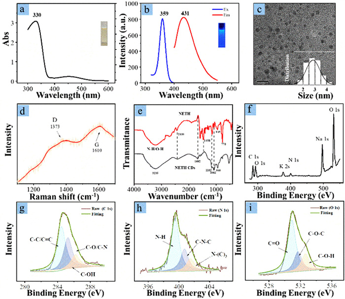 | Fig. 2. Characterization of NETH-CDs: (a) UV–vis absorption spectra, (b) fluorescence spectra, (c) HRTEM, (d) Raman, (e) FT-IR, and (f) XPS spectra. Inset of (c) The statistical size distribution from HRTEM result. (g-i) Fitted C 1s, N 1s and O 1s XPS spectrum. | |