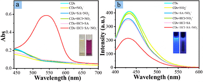 Griess reaction is a nitrite-induced NETH-aniline coupling reaction under acidic condition [25], which has been listed as an International Standard (ISO 6777–1984) for colorimetric nitrite identification. In general, raw materials or relevant functional groups are preserved on the CD surface during carbonization; such character has been extensively explored for constructing functional CDs with specifically discriminating or antimicrobial properties [26]. In view of this factor, we hypothesized that the preservation of NETH on CD surface is possible and the remained NETH may also support the Griess reaction. To understand whether the Griess reaction is feasible, chromogenic agent (p-aminobenzene sulfonic acid, SA) was introduced into NETH-CD solution in the presence of HCl and NaNO2. It was observed that the NETH-CD solution color changed from light yellow to purple within 1 min (Fig. 3a inset), suggesting that azo compounds might form. Meanwhile, control experiments with only SA, HCl, or NaNO2 were also conducted. As shown in Fig. 3a, simultaneous introduction of SA, HCl, and NaNO2 into NETH-CD solution resulted in the appearance of new UV-visible absorption peak around 538 nm, which is assigned to the characteristic peak of azo dye. In contrast, the addition of NaNO2 or mixtures (SA + HCl, SA + NaNO2, or HCl + NaNO2) didn't cause comparable variation to the UV-visible absorption spectra. The formation of azo dye also led to the fluorescence quenching of NETH-CDs. As shown in Fig. 3b, the blue emission of NETH-CDs was dramatically suppressed upon adding SA, HCl, and NaNO2. Similar to the colorimetric variation, addition of sole or two chemicals did not induce distinct fluorescence inhibition.