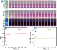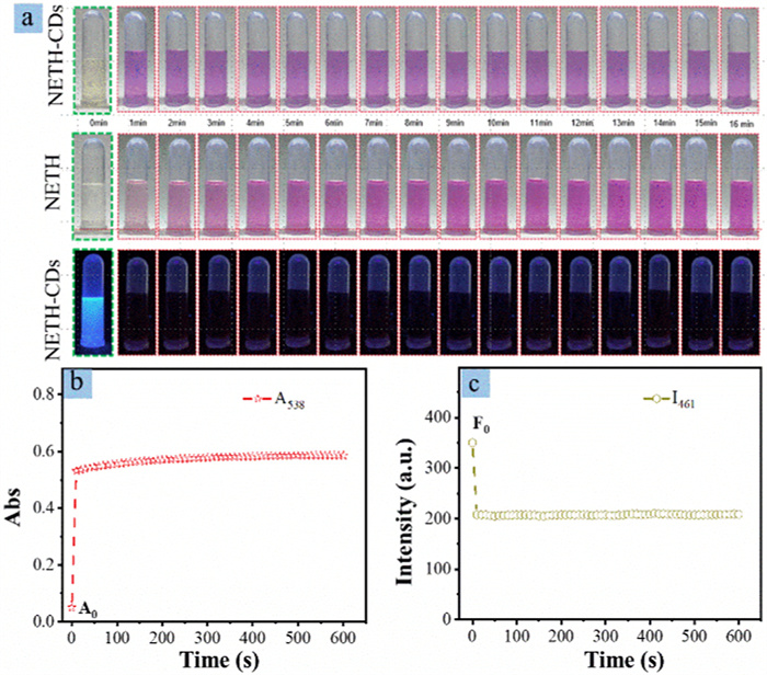 | Fig. 4. Griess reaction kinetics on NETH-CD nanointerface. (a) Time-dependent photographs of NETH and NETH-CD solution upon adding nitrite under room light and UV light illumination. (b) Plots of the time-dependent 538 nm absorbance of NETH-CD solution upon adding nitrite. (c) Plots of the time-dependent 461 nm fluorescence intensity of NETH-CD solution upon adding nitrite. | |