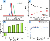 | Fig. 5. Griess reaction kinetics on NETH-CD nanointerface. (a) Time-dependent photographs of NETH and NETH-CD solution upon adding nitrite under room light and UV light illumination. (b) Plots of the time-dependent 538 nm absorbance of NETH-CD solution upon adding nitrite. (c) Plots of the time-dependent 461 nm fluorescence intensity of NETH-CD solution upon adding nitrite. (d) Time-dependent 538 nm absorbance of NETH-CNT mixture in the presence of SA and HCl upon adding nitrite without and with 1 h incubation. | |