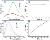 | Fig. 6. Reaction kinetics of OPD-Cu2+ system with and without carbonization treatment. Time-dependent fluorescence emission spectra of (a) E-CDs and (c) OPD solution with the addition of 5 µmol/L Cu2+. The corresponding plots of fluorescence intensity versus reaction time were listed in (b) and (d). | |