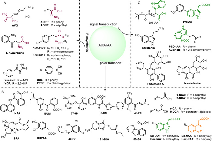 | Fig. 1. (A) Small molecules that regulate auxin biosynthesis. (B) Small molecules regulating the polar transport of auxin. (C) Small molecules that regulate auxin signal transduction. | |