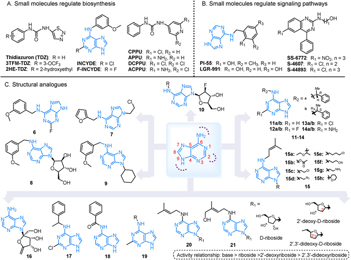 | Fig. 2. (A) Small molecules that regulate CTK biosynthesis. (B) Small molecules that regulate CTK signal transduction. (C) Structural analogues based on cytokinin skeleton modification. | |