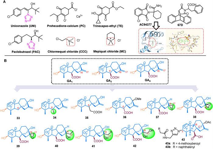 | Fig. 3. (A) The regulatory role of small molecules in GA biosynthesis and signal pathways. (B) Structural analogues. | |