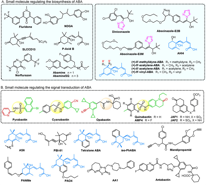 | Fig. 4. (A) Small molecule that regulates ABA biosynthesis. (B) Small molecule that regulates ABA signal transduction. | |