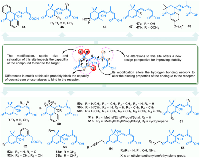 7.2. ABA structural analogues derived from backbone modificationsABA is a key stress signaling molecule in plants, and modifying its structure can enhance its effectiveness in managing abiotic and biotic stresses in agriculture. Several ABA derivatives have been synthesized based on its core structure (Fig. 5). For example, compound 44 shows a moderate effect on corn cell growth but is less potent than ABA. At a concentration of 33 µmol/L, its inhibitory effect is comparable to ABA at 10 µmol/L [124]. In contrast, compound 45 can induce stomatal closure without affecting seed germination or root growth. Its inhibition of PP2C is linked to its interaction with PYL5 and/or PYL6, with a binding affinity (Ka) of 0.88 µmol/L, making it 5–20 times more effective than ABA [125]. Among compounds 47–49, compound 47b, at 2 mg/L promotes stomatal closure and reduces water loss, enhancing drought tolerance in tobacco seedlings. Compounds 47a and 49 affect the elongation of rice seedlings and the germination of lettuce seeds, respectively [126]. Compound 47 specifically triggers ABA-mediated stomatal responses in A. thaliana, while compound 48 shows increased receptor binding affinity with a longer alkoxy chain [127,128]. Compounds 50a and 50b are used for detecting PYL. The hydroxyl group at position 1 is crucial for seed germination and development, and replacing it with –OCH3 reduces inhibitory efficacy by disrupting hydrogen bonds [129,130]. iso-PhABA analog 50c has slightly lower efficacy in inhibiting seed germination and rice seedling growth compared to iso-PhABA [129]. The structure-activity relationship indicates that the number and placement of -CH3 groups, as well as the substitution of hydrogen with -CH3, significantly impact the compound's activity [129]. A quaternary carbon at the 2′ or 3′ position is essential for maintaining ABA-like biological activity, particularly with demethylation at the 3′ position enhancing efficacy [129]. Due to ABA's photolability, its agricultural use is limited. However, photostable analogues 52a/52b, with the α, β-unsaturated carbonyl group of 52a reduced to 52b, show similar ABA activity. These analogues inhibit seed germination in tomatoes, lettuce, and rice, and promote drought tolerance in A. thaliana. Compound 52b does not activate PYL in vitro and may have higher membrane permeability due to ester substitution for the hydrophilic group (-COOH) in compound 52a [131].