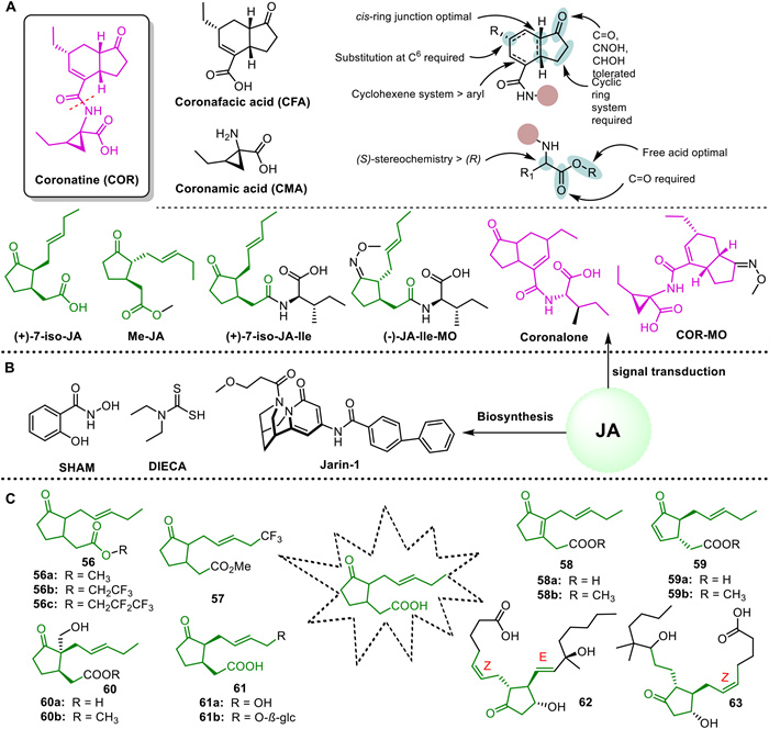 | Fig. 6. (A) Small molecules modulating the JA signaling pathway. (B) Small molecules involved in JA biosynthesis. (C) JA structural analogues. | |