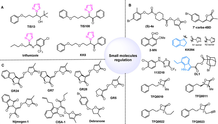 | Fig. 7. (A) Small molecule regulating SL biosynthesis. (B) Small molecules modulating the SL signaling pathway. (C) SL analogues. | |
