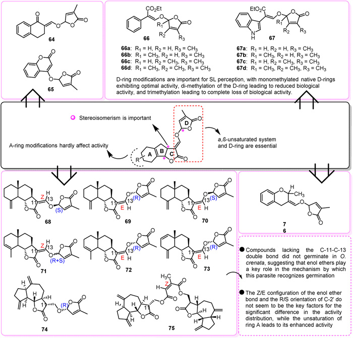 9.3. Structural analogues containing an active skeleton D ringSeveral analogs, such as Nijmegen-1, were designed and synthesized based on the structural model of natural SLs with a D ring connected by an enol ether group. In pot experiments, compounds 64 and 65 showed promise as suicidal germinants [173]. Compounds 66a and 67a, both containing monomethylated native D rings, proved exceptionally effective, demonstrating potency comparable to GR24 against P. ramosa and significantly higher activity against O. minor. In contrast, compounds 66d and 67d, featuring trimethylated D rings, displayed no activity [174]. Additionally, compounds 66b/66c showed higher activity compared to 67b/67c, highlighting the significance of D-ring modification in SL sensing. Dimethylation resulted in decreased biological activity, while trimethylation led to a complete loss of activity [174]. Among the tested analogs, compounds 69, 70, 72, 74, and 75 were most effective in promoting P. ramosa germination. For O. cumana, compounds 71 and 72 showed the highest effectiveness, and for O. crenata, compounds 71 and 72 displayed the highest germination stimulation rates [175]. The presence of a 2-alkyl group in the dihydroflavone skeleton was found to be crucial for seed germination activity. Compound 76, containing a -CH3 group, exhibited tenfold higher germination activity compared to the control GR24 [176,177]. Strigolactones play a role in signaling the development of arbuscular mycorrhizal fungi and act as triggers for the germination of parasitic weed seeds (Fig. 8).