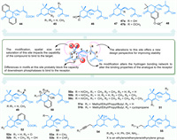 Strigolactone antagonists can block the biological reactions triggered by agonist-activated receptors, regulate crop yields by altering tiller numbers, and prevent seed germination in root parasitic plants for crop protection [161]. Carba-SL inhibits the interaction between D14 and D53 by suppressing D14 hydrolysis activity, thereby inhibiting SL-induced tillering in rice. The D ring of 7′-carba-4BD remains attached to the skeleton upon hydrolysis by D14, functioning as an antagonist rather than an agonist [162]. KK094, a regioisomeric mixture (KK094-N1 and KK094-N2), forms a covalent bond with D14, and upon degradation, the product binds covalently to the Ser residue of the D14 catalytic triad, with its indole structure playing a crucial role [163]. Additionally, 2-methoxy-1-naphthaldehyde (2-MN) inhibits the interaction between D14-SLR1 and D14-D53, restoring the growth of rice tiller buds inhibited by SL [164]. DL1 inhibits SL-induced expression of BRC1 at submicromolar levels, acting locally within buds to suppress rosette branch outgrowth. Structure-activity relationship studies reveal that DL1's ethyl indole moiety is positioned close to the D14 catalytic site, significantly enhancing its inhibitory potency [165]. TFQ0010 has been identified as a potent inhibitor of AtD14, while its enantiomer TFQ0011 exhibits lower potency, indicating a specific chiral environment in the binding pocket. Compounds TFQ0022 and TFQ0023, with propyl and propargyl groups at C-3, inhibit the SL-induced interaction between AtD14 and MAX2 in vitro, consequently restraining hypocotyl elongation in A. thaliana seedlings [166].