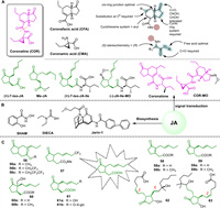 Coronatine (COR), derived from Pseudomonas syringae pv. atropurpurea, acts as a non-host-specific agonist of JA-Ile. It consists of coronanic acid (CMA) fused with α-amino acids and coronafacic acid (CFA) with a polyketide structure, connected by amide bonds. The biological activity of COR is influenced by the cis stereochemistry of the CMA ring, the C-6 position substitution, the α-carbon substitution retaining S-stereochemistry of CMA, and the free carboxyl terminus of the amino acid (Fig. 6A) [143]. Similar to JA-Ile, COR inhibits the degradation pathway of JA-Ile, resulting in increased stability and binding affinity to COI1. Consequently, COR is preferred over JA in various applications [144,145]. Applying COR on wheat under drought and normal conditions enhances resistance by improving water metabolism, photosynthesis, antioxidant enzyme activity, and reducing MDA and superoxide content [146]. Additionally, coronalone, an analog of COR, elicits JA-like responses in plants, stimulating volatile compound production and defense mechanisms against insect predation [142]. Building upon COR, JA-Ile-MO, and COR-MO have been synthesized, with COR-MO proving to be a potent antagonist, impeding COI1-JAZ interaction, JAZ degradation, and obstructing the JA signaling pathway as a competitive antagonist [147].