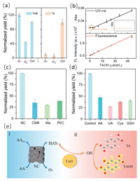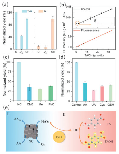 | Fig. 3. (a) Reactivity of TMB and TA against various free reactive oxygen radicals. (b) UV–vis and fluorescence spectra of TAOH. (c) Reactivity of the cascade system constructed using different oxidases and CuO. (d) Reactivity of CuO—NC cascade system used to detect different substrates. (e) Scheme of the NC—CuO cascade system. | |
