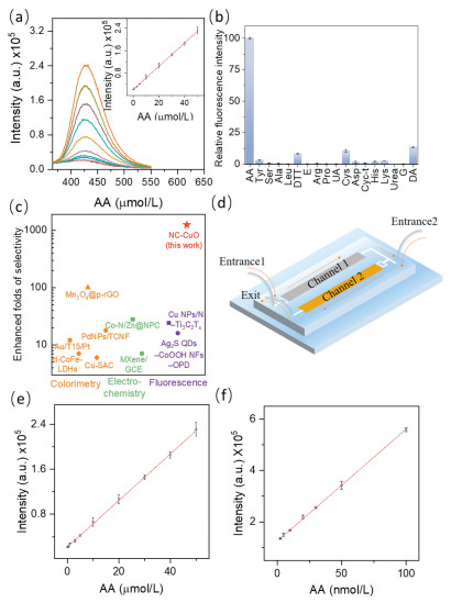 In summary, based on a nanozyme catalytic system with high reaction specificity, we developed a cascaded fluorescence sensing system for the selective and sensitive detection of AA against various interferences. AA was oxidized by NC to produce AAox and the by-product H2O2. The second step of cascade transformation was induced by the addition of CuO nanozymes. Further using the •OH generated by CuO-catalyzed reaction to oxidize TA, a fluorescence sensing platform was constructed for AA with a linear detection range of 2.5-100 nmol/L/0.1-50 µmol/L and a low limit of detection of 0.77 nmol/L/0.085 mol/L in a spatially confined microfluidic reactor and an open reactor, respectively. More importantly, the AA detection by cascaded fluorescence sensing system had excellent selectivity by combining more substrate-specific reaction and stood out from over a dozen interferents, such as UA, urea, Glu without any biorecognition units. Notably, the cascade strategy comprehensively considers the reaction specificity of the nanozymes and the signal output mode. By combining the two, sensing targets with high sensitivity and high selectivity were realized. This study offers a new direction for the design of nanozymatic assays with enhanced sensitivity and selectivity.