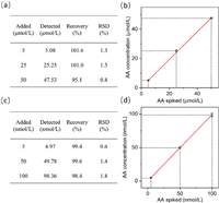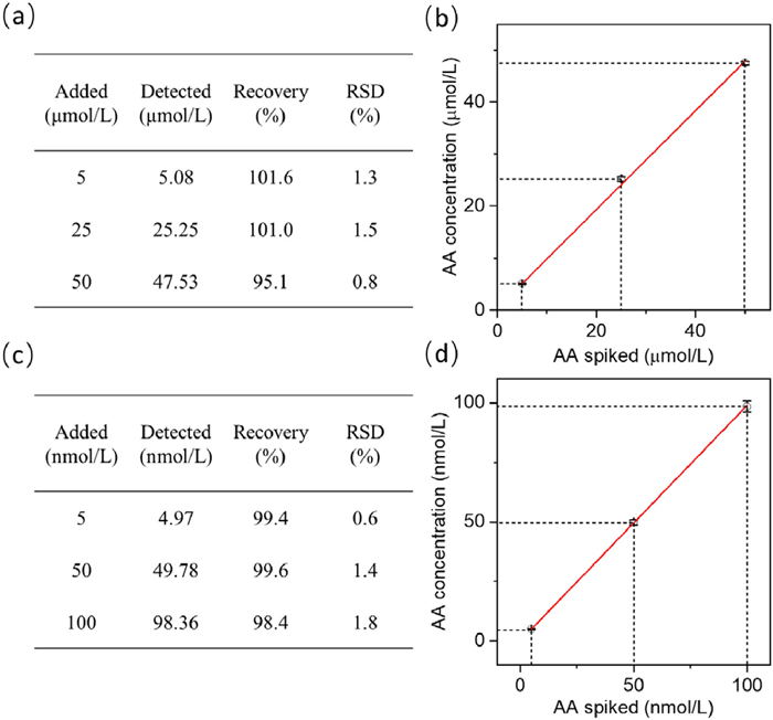 To prove the suitability and feasibility of the established platform for AA detection in biological samples, the analytical performance of the sensing strategy was evaluated. Since bovine serum albumin is one of the most widely studied proteins and is similar to human serum albumin, the analytical performance of 10% diluted bovine serum supplemented with AA was evaluated. Recovery rate experiments were performed in the open system. AA was added to the diluted serum samples at concentrations of 5, 25 and 50 µmol/L, and the recoveries of AA mixed with serum samples ranged from 95.1% to 101.6% (Figs. 5a and b). Recovery experiments were also performed in a microfluidic system. AA was added to the diluted serum samples at concentrations of 5, 50 and 100 nmol/L, the recoveries of AA mixed with serum samples ranged from 98.4% to 99.6% (Figs. 5c and d). These findings confirmed the accuracy and strong dependability of AA detection.