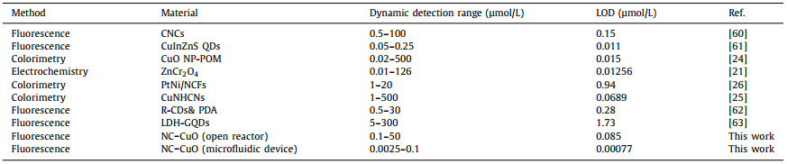 It should be noted that CuO was chosen for this study for several reasons. First, CuO catalyzes the formation of •OH from H2O2, and the reaction has been demonstrated to have good specificity through experiments and theoretical calculations. Secondly, the •OH produced by CuO catalyzed H2O2 can specifically bind to the fluorescent probe TA. In addition, CuO cannot directly catalyze the oxidative color development of TA and does not interfere with the sensing system. All this makes the CuO-catalyzed reaction more specific, enabling the cascade system with better selectivity.