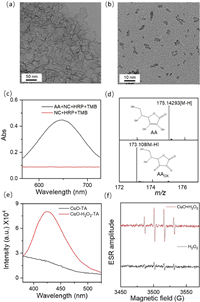 | Fig. 1. TEM images of (a) NC and (b) CuO. (c) UV–vis spectra of the TMB-HRP kit for the NC-catalyzed reaction before and after adding AA. (d) ESI-MS spectra of AA before and after the catalytic oxidation by NC. (e) Fluorescence spectra of TA before and after oxidation with H2O2. (f) ESR spectra of H2O2 before and after addition of CuO. | |