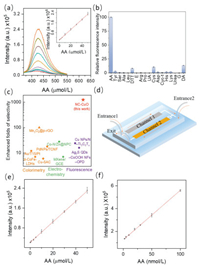 | Fig. 4. (a) Fluorescence spectra of TA oxidation products generated from the NC—CuO cascade system with different AA concentrations. Inset: calibration curve of fluorescence intensity with concentration of AA. (b) Fluorescence intensity of the TA oxidation product generated from the NC—CuO nanozyme cascade system using AA and other small molecules as potential interfering substrates. (c) Comparison of the enhanced folds of selectivity for AA using different detection methods [40-48]. (d) Scheme of microfluidic reactor containing cascade NC—CuO. Calibration curves of fluorescence intensity with AA concentration in the (e) open reactor and (f) spatially confined microfluidic reactor. | |