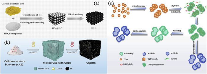 | Fig. 1. (a) The synthesized illustration of hard carbon from carbon quantum dots. Reproduced with permission [43]. Copyright 2019, Elsevier. (b) The designed illustration of CQDHC. Reproduced with permission [45]. Copyright 2022, Elsevier. (c) Schematic of the synthesis of N-doped carbon from carbon quantum dots. Reproduced with permission [48]. Copyright 2019, Elsevier. | |