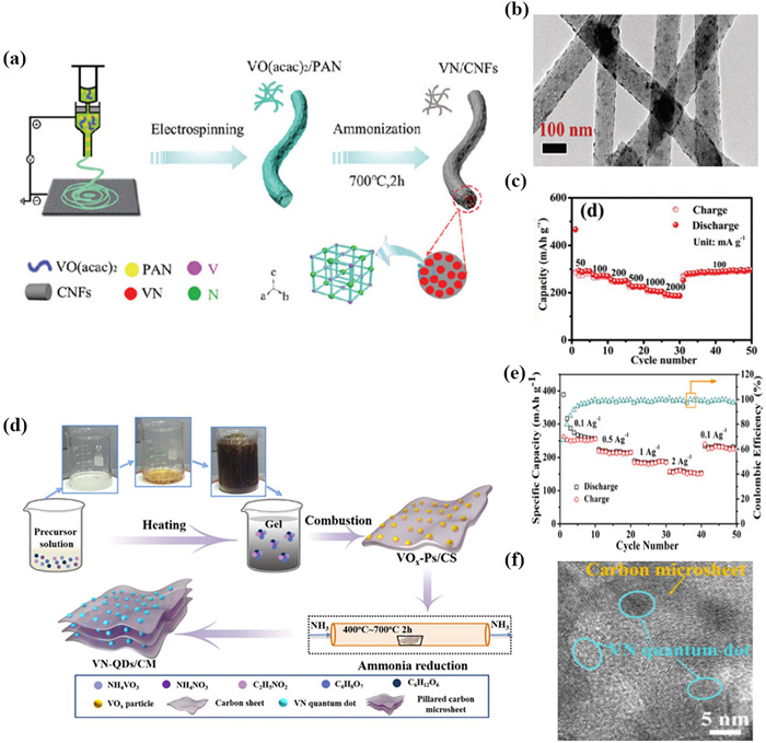 | Fig. 10. (a) Synthesis routes of the VN/CNF. (b) TEM image of VN/CNF composite. (c) Rate performance of VN/CNF. Reproduced with permission [84]. Copyright 2020, Royal Society of Chemistry. (d) Schematic illustration of the synthesis of the VN-QDs/CM composites. (e) Rate performance of VN-QDS/CM-600. (f) High-resolution TEM image of VN-QDS/CM-600 after 100 cycles. Reproduced with permission [85]. Copyright 2019, Elsevier. | |