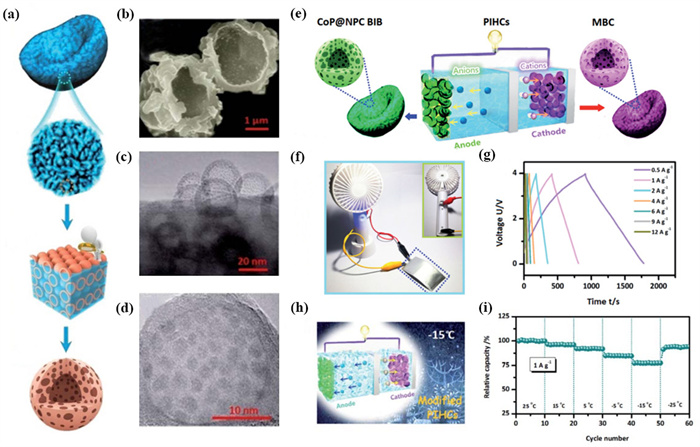 | Fig. 11. (a) Schematic illustration of the synthesis of the “bubble-in-bowl” (BIB) structured CoP@NPC (CoP@NPC BIB). (b) SEM image and TEM images (c, d) of CoP@NPC BIB. (e) Schematic illustration of the potassium ion hybrid capacitors (PIHCs). (f) Photos of the PIHCs powering an electronic fan. (g) Charging/discharging curves of the PIHCs. (h) Scene diagram of PIHCs working in low-temperature environment. (i) Rate performance of PIHCs at −15 ℃. Reproduced with permission [89]. Copyright 2021, Royal Society of Chemistry. | |