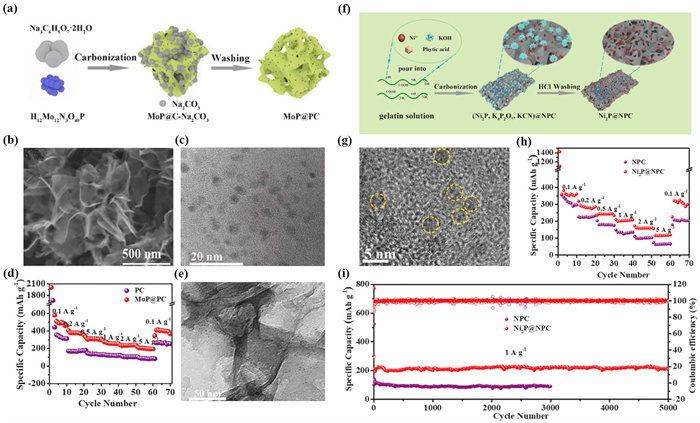 | Fig. 12. (a) Schematic illustration of the synthesis of the MoP@PC. (b) SEM image and (c) high-resolution image of MoP@PC. (d) Rate performance of MoP@PC at various current densities from 0.1 A/g to 5 A/g. (e) TEM image of MoP@PC after 1000 cycles at 5 A/g. Reproduced with permission [92]. Copyright 2021, Elsevier. (f) The synthesis routs of Ni2P@NPC. (g) High-resolution TEM image of Ni2P@NPC. Rate performance (h) and long cycling stability (i) at 1 A/g of Ni2P@NPC. Reproduced with permission [93]. Copyright 2021, Elsevier. | |