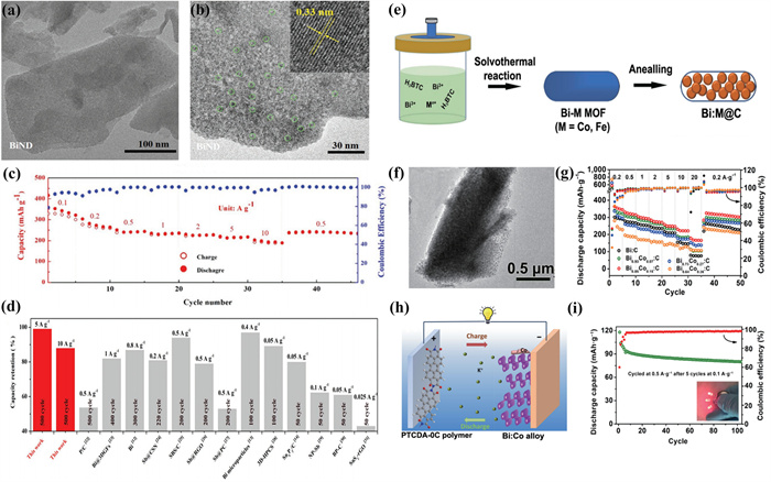 | Fig. 13. (a) TEM and (b) high-resolution TEM of BiND. (c) Rate performance of BiND/G at various current densities from 0.1 A/g to 10 A/g. (d) Comparison of capacity retention rate between BiND/G and other anode electrode materials for potassium ion battery. Reproduced with permission [102]. Copyright 2019, Wiley. (e) The synthesis routes of Bi:Co and Bi:Fe alloys nanodots and carbon composites. (f) HRTEM image of Bi0.85Co0.15@C composites. (g) Rate performance of Bi:Co@C. (h) Schematic diagram of the PTCDA-0C//Bi0.85Co0.15@C potassium ion full battery. (i) Cycling stability of the full potassium ion batteries. Reproduced with permission [103]. Copyright 2022, Springer. | |