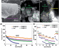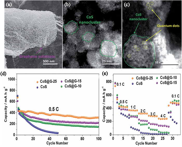 | Fig. 4. (a) SEM image of CoS@G-25. (b) TEM image and (c) dark field image of CoS@G-25. (d) Cycle performance and (e) rate performance of CoS, CoS@G-25, CoS@G-10, and CoS@G-15. Reproduced with permission [70]. Copyright 2017, Wiley. | |