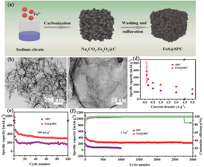 | Fig. 5. (a) The synthesized routs of FeS@SPC. (b) TEM image and (c) high-resolution TEM image of FeS@SPC. (d) Rate performance of FeS@SPC. Cycling performance of FeS@SPC at (e) 100 mA/g and (f) 1 A/g. Reproduced with permission [71]. Copyright 2021, Elsevier. | |