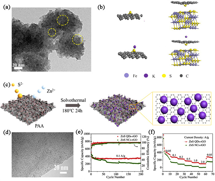 | Fig. 6. (a) TEM image of FeS@SPC after 3000 cycles at 1 A/g. (b) The models of K+ adsorption behavior on FeS@SPC. Reproduced with permission [71]. Copyright 2021, Elsevier. (c) Synthesis diagram of ZnS QDs-rGO. (d) TEM image of ZnS QDs-rGO. (e) Cycle performance at 0.1 A/g and (f) rate performance of ZnS QDs-rGO. Reproduced with permission [72]. Copyright 2021, Elsevier. | |