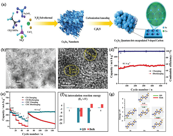| Fig. 7. (a) Schematic illustration of synthesis Co3Se4 quantum dots encapsulated by N-doped carbon (CSC). (b) TEM and (c) HRTEM image of CSC. (d) Cycling performance at 0.1 A/g and (e) rate performance of CSC. (f) K+-intercalation reaction energy for Co3Se4 QDs. (g) K+ migration energy barrier and reaction energy for Co3Se4 QDs. Reproduced with permission [76]. Copyright 2021, Wiley. | |