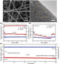 | Fig. 2. (a) SEM image and (b) TEM image of Mo2C/NCNFs. (c) Cycle performance (0.1 A/g) and (d) rate performance of Mo2C/NCNFs. (e) Cycle performance of Mo2C/NCNFs at 1 A/g. Reproduced with permission [55]. Copyright 2021, Elsevier. | |