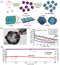 | Fig. 8. (a) The synthesis process of Co0.85Se-QDs/C composite. (b) TEM image of Co0.85Se-QDs/C-20. (c) Rate performance of Co0.85Se-QDs/C composite. (d) Cycling stability of Co0.85Se-QDs/C-20 at 1 A/g. Reproduced with permission [77]. Copyright 2019, The authors. | |