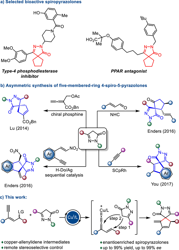 In summary, we have described a copper-catalyzed asymmetric [4 + 1] annulation of yne–allylic esters with pyrozalones by remote stereocontrol in high yields (up to 99%) with excellent enantioselectivities (up to 99%/99% ee) and moderate diastereoselectivities (up to 82:18 dr). This method enables the transformation of yne–allylic esters into highly enantioenriched spiropyrazolones containing all-carbon quaternary sterogenic centers.