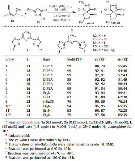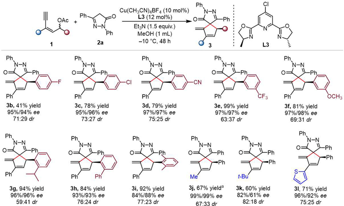 Our investigations were implemented with yne–allylic acetate 1a and 1,3-diphenyl-pyrazolone 2a (Table 1). The investigation revealed that the Ph-PyBox ligand L1 delivered the desired product 3a in 99% yield, albeit with moderate enantiocontrol in the presence of a Cu(Ⅰ) catalyst with DIPEA as the base in MeOH (entry 1). The ee value of 3a with less steric hindrance Me-PyBox ligand L2 could be enhanced to 92%/91% ee with 54:46 dr (entry 2). Further investigation of the C4-substitution effect of the pyridine moieties in the Me-PyBox ligands indicated that both enantioselectivity and diastereoselectivity were affected. With the ligand L3 gave the highest enantioselectivity (entries 3–6). Screening different bases showed that Et3N provided promising results in terms of ee and dr values (entries 7–9). After further optimization of reaction parameters, such as reaction temperature and time, we found that the ee and dr values of 3a could be enhanced to 96%/97% and 72:28, respectively, at –10 ℃ (entries 10–12).