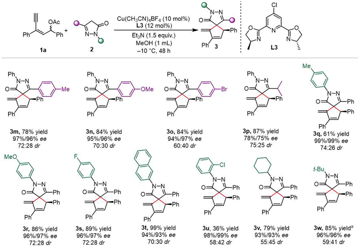 | Scheme 3. Scope of pyrazolones. a Separate the diastereomers: syn-3w = 43%, anti-3w = 41%. | |