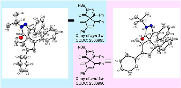 With the optimal conditions in hand, we then probed the scope of yne–allylic acetates for this asymmetric [4 + 1] annulation reaction (Scheme 2). A series of aryl yne–allylic acetates with electron-donating or -withdrawing substituents reacted smoothly, affording spiropyrazolones in excellent yields with good enantioselectivities and moderated diastereoselectivities. Halogens and cyano group at the para-position in yne–allylic acetates were compatible, giving the spirocycles products 3b–3d in good yields with excellent ee values. The reaction tolerated meta- and ortho-substituted aryl yne–allylic acetates (3e–3h) very well. Even yne–allylic acetetes adjacent to the more sterically bulky 2,6-dimethylphenyl group reacted smoothly, resulting in the desired product 3i with an excellent yield, albeit with a decreased ee value. However, the less reactive aliphatic yne–allylic acetates led to diminished yield. The Me-substituted yne–allylic acetate provided annulation product 3j in 99%/99% ee values. However, the ee values of the more sterically bulky t-Bu-substituted substrate decreased to 82%/61% (3k). Remarkably, thiophenyl-substituted yne–allylic ester delivered the corresponding product 3l with good yield and excellent ee values. Subsequently, various pyrazolones were explored in the asymmetric [4 + 1] annulation (Scheme 3). Different aryl-substituents at the 3-position of the pyrazolones, delivered the desired spiropyrazolones 3m, 3n, and 3o in good yields with excellent ee values. Notably, the bulky isopropyl at the 3-position of the pyrazolones also showed good compatibility, yielding the desired annulation product 3p in excellent yield, albeit with a decrease in ee. Various N-aryl groups of the pyrazolones were well-tolerated, giving 3q–3u in good yields and moderate enantioselectivity. Importantly, N-alkyl group of the pyrazolones also reacted well, albeit with low dr values (3v, 3w). Notably, two diastereomers of syn-3w and anti-3w can be isolated by column chromatography. We are delighted to observe that our developed method enables the isolation of some products. Finally, the absolute configurations of product syn-3w (CCDC: 2306695) and anti-3w (CCDC: 2306696) were unambiguously assigned by X-ray diffraction analysis (Scheme 4).