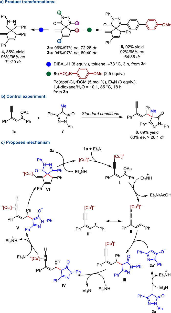 To demonstrate the synthetic utility of this method, the obtained spiropyrazolones were subjected to a selection of derivatizations (Scheme 5a). The amide group in 3a was successfully reduced with DIBAL-H, affording the pyrazoline derivative 4 in 85% yield with 71:29 dr and 96%/96% ee. The Suzuki coupling of 3o with boronic acid 5 resulted in the formation of chiral-preserving coupling product 6.