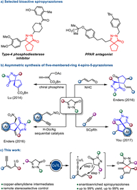 Spiropyrazolones and heterocyclic-fused analogues are important molecular scaffolds in natural products, biologically active molecules, and pharmaceuticals (Scheme 1a) [1-4]. Consequently, considerable efforts have been devoted to the asymmetric synthesis of five-membered spiropyrazolones. For example, Lu's group developed the first phosphine-catalyzed enantioselective [4 + 1] annulation of substituted allenoates for the formation of enriched 4-spiro-5-pyrazolones [5]. Whereas Enders and co-workers reported an organocatalytic Michael addition/Ag-catalyzed Conia-ene reaction between alkyne-tethered nitroalkenes and pyrazolones [6]. The same group also described an asymmetric NHC-catalyzed [3 + 2] annulation of cinnamaldehyde derivatives with pyrazolones [7]. Particularly, You's group pioneered the asymmetric rhodium-catalyzed C(sp2)–H functionalization of 4-aryl-5-pyrazolones and subsequent annulation with alkynes for the asymmetric synthesis of highly enantioenriched five-membered-ring 4-spiro-5-pyrazolones (Scheme 1b) [8].