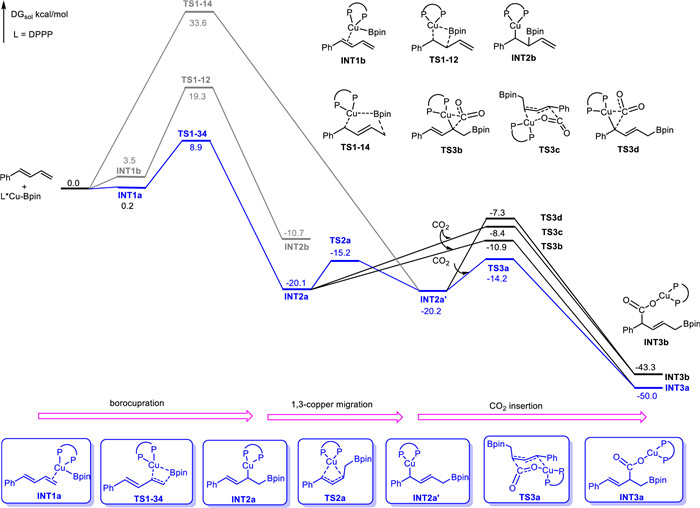 | Fig. 1. Energy profiles of Cu(Ⅰ)/DPPP catalyzed boracarboxylation of 1-phenyl-1,3-butadiene with CO2. | |