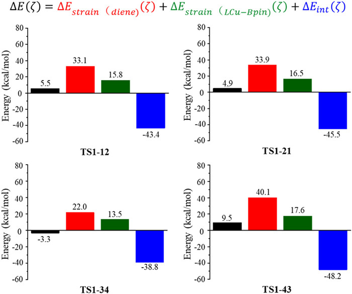 To get insight into the energy differences, the distortion/interaction-activation strain analysis (DIAS), also called the activation strain model, was conducted to the borocupration. In this model, the activation energy ∆E(ζ) is decomposed into the distortion energy term (ΔEstrain) and the interaction energy term (ΔEint): ∆E(ζ) = ΔEstrain + ΔEint [58,59]. The distortion energy, which is related to the structural distortion that reactants (1-phenyl-1,3-butadiene and LCu-Bpin) deform from equilibrium geometries to fragments in transition structures (TS1), is decomposed into ∆Estrain(diene(ζ) (Fig. 2, red bar) and ∆Estrain(LCu-Bpin)(ζ) (green bar). The interaction energy ∆Eint(ζ) (blue bar) is the energy of the combination of the two distorted reactants to adjust their electronic structure. As shown in Fig. 2, with a similar ∆Estrain(LCu-Bpin)(ζ) for the four transition states (TS1-12, TS1-21, TS1-34, and TS1-43), the lowest ∆E(ζ) (black bar) for TS1-34 is attributed to the lowest distortion energy (∆Estrain(diene)(ζ) = 22.0 kcal/mol) of 1-phenyl-1,3-butadiene. The results indicate that the regioselectivity of borocupration procedure is determined by the degree of substrate distortion during the interaction with the catalyst. Minimal substrate distortion occurs when the borocupration undergoes on the C3 and C4 positions of 1-phenyl-1,3-butadiene, thus giving priority to 3,4-regioselectivity.
