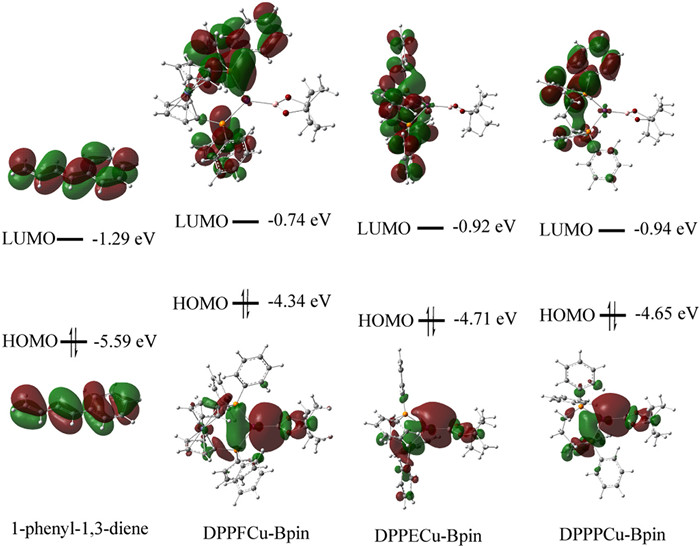 Having obtained the energy distribution of the boracarboxylation reaction and the most favorable 3,4-regioselectivity, the ligand effect on diversity of catalytic activities that different Cu(Ⅰ)/biphosphine complexes showed was then explored via the frontier molecular orbital theory. The frontier molecular orbitals of 1-phenyl-1,3-butadiene and LCu-Bpin species are shown in Fig. 3 [60,61]. It is revealed that the energy gap between the HOMO orbital of DPPFCu-Bpin complex (σ orbital) and the LUMO orbital of 1-phenyl-1,3-butadiene (π* orbital) is strikingly small, enabling the ligand of DPPF more favorable for the 3,4-borocupration process than other ligands, thus facilitating the followed 3,4-boracarboxylation more efficiently.