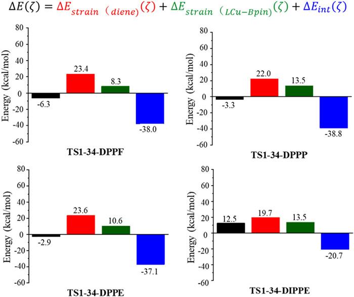 To further dissect the influence of different bisphosphine ligands on the 3,4-borocupration, DIAS analysis on the transition states of 3,4-borocupration that four representative ligands participated, expressed as TS1-34-DPPE, TS1-34-DPPP, TS1-34-DPPF, and TS1-34-DIPPF, were carried out. The result indicates that the energy difference in 3,4-borocupration is predominantly determined by the interaction energy ∆Eint(ζ) between the distorted catalyst and substrate (Fig. 4).