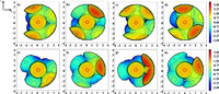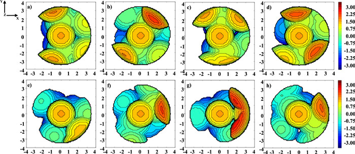 | Fig. 5. Steric maps of (a) DPPP, (b) BINAP, (c) DIOP, (d) DPPF, (e) DPPM, (f) DPPH, (g) DPPBz, (h) DPPE. The unit of color code is Å. The plane of the Cu atom is horizon and the steric maps are viewed down the z axis. The red and blue zones indicate the more- and less-hindered zones in the catalytic pocket, respectively. Catalytic pocket images were generated with SambVca 2.1 [65]. | |