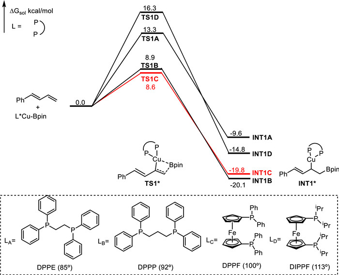 | Fig. 7. Energy profiles of the formation Cu(Ⅰ)/bisphosphine-catalyzed borocupration of 1-phenyl-1,3-butadiene. | |