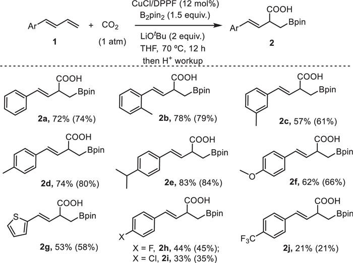 | Scheme 2. Scope of 1-aryl-1,3-butadienes. Reaction conditions: 1 (0.250 mmol), CuCl (0.003 g, 0.030 mmol), DPPF (0.017 g, 0.030 mmol), B2pin2 (0.095 g, 0.375 mmol), LiOtBu (0.040 g, 0.500 mmol), THF (3 mL), CO2 (99.999%, 1 atm, closed), 70 ℃, 12 h, then workup using 8 mL 1 mol/L HCl. Isolated yield. The yields in brackets were determined by 1H NMR technique using 1,1,2,2-tetrachloroethane as initial standard. | |