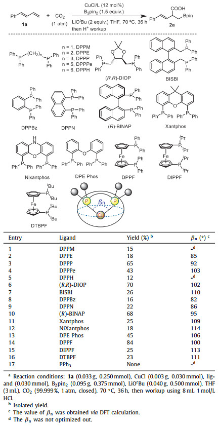 Table 1 Various Cu(Ⅰ)/biphosphine ligands catalyzed 3,4-boracarboxylation of 1a with CO2.a |