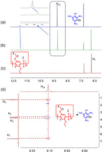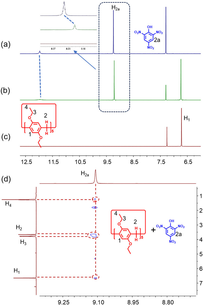 | Fig. 1. Partial 1H NMR spectra (400 MHz, CDCl3, 293 K): (a) G2, (b) a mixture of G2 (10.0 mmol/L) and EtP5 (10.0 mmol/L) and (c) EtP5. (d) Partial NOESY NMR spectrum (500 MHz, CDCl3, 293 K): G2 (10.0 mmol/L) and EtP5 (10.0 mmol/L). | |